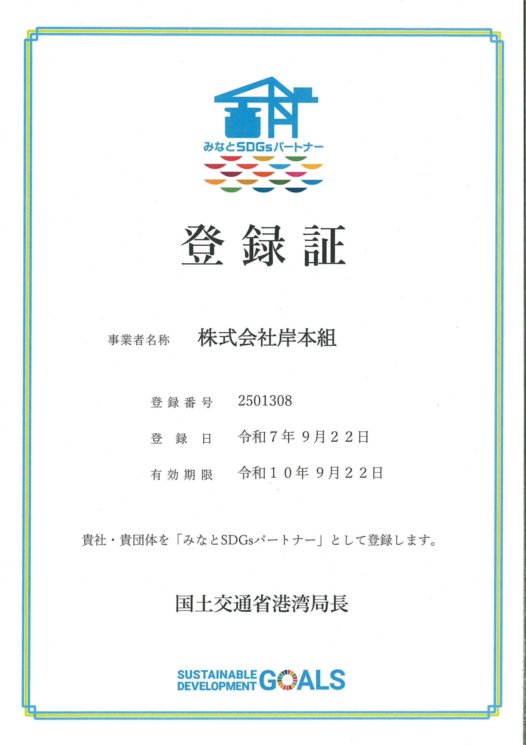 SDGsの普及促進と取組の更なる推進を図り、港湾関係産業の魅力向上と将来にわたる持続的な発展に資することを目的として、国土交通省港湾局が創設した「みなとSDGsパートナー登録制度」において、当社が「みなとSDGsパートナー」として登録されました。